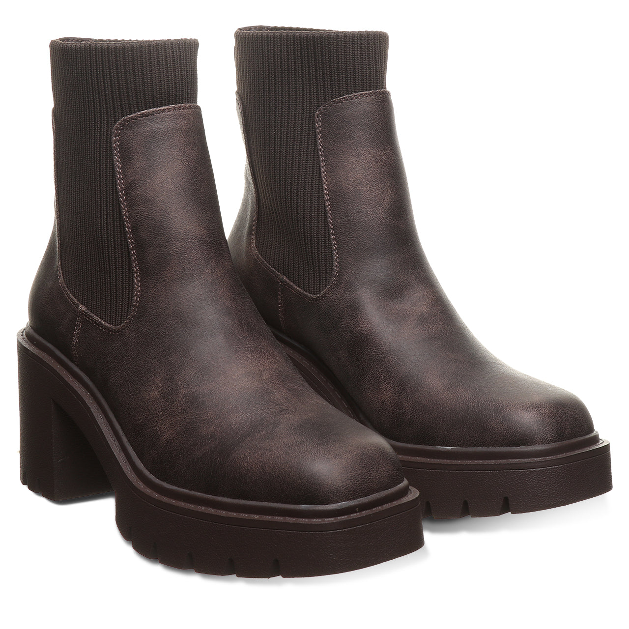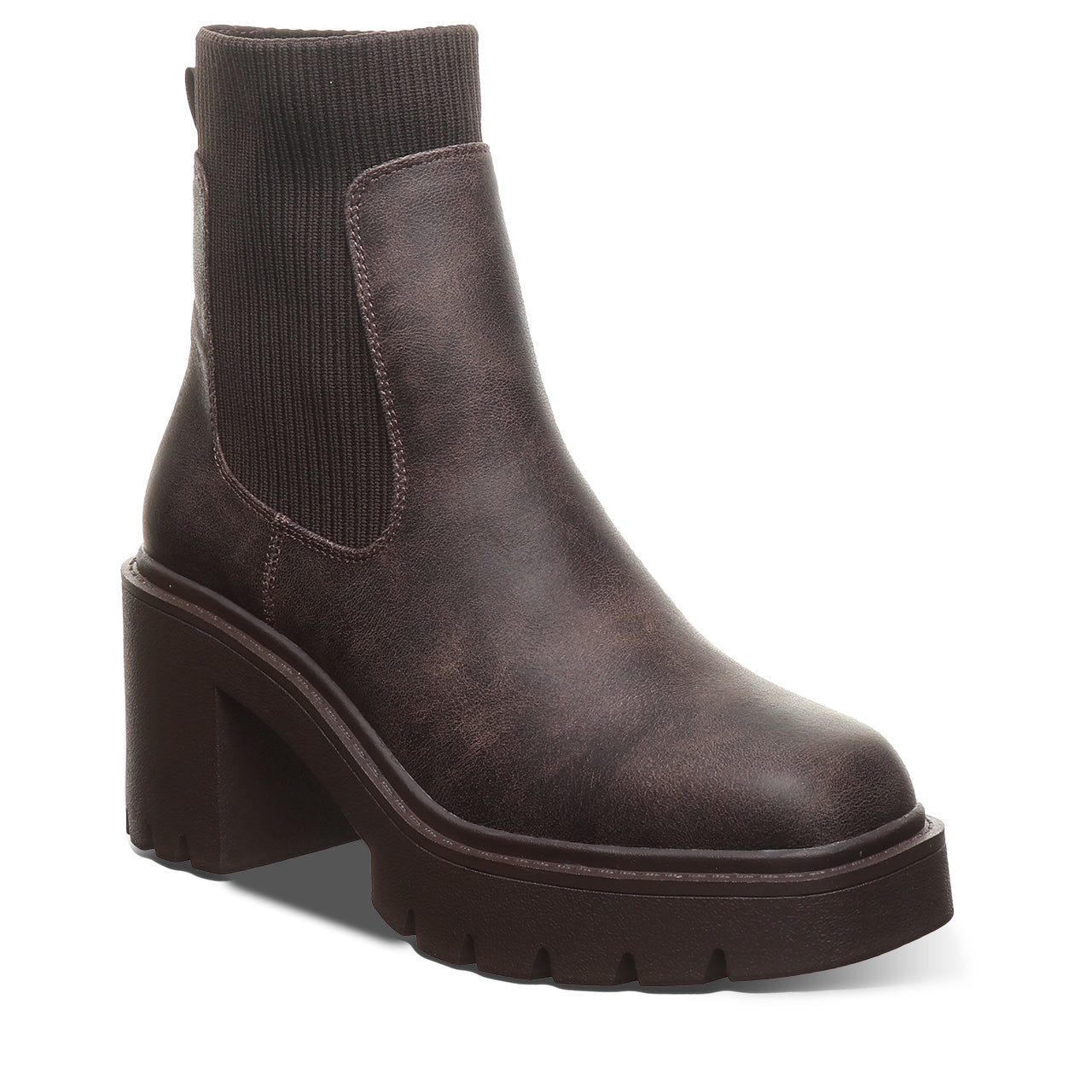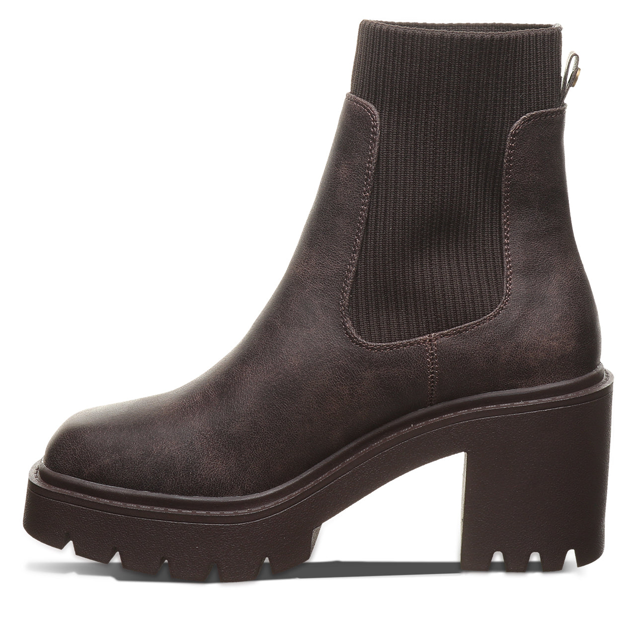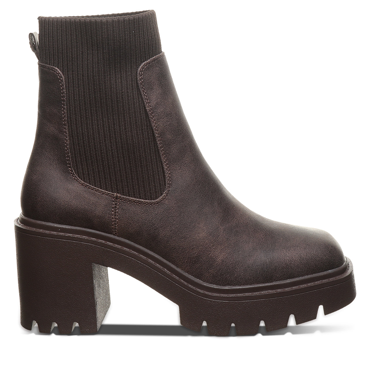 Meet your new go-to boot for bold. everyday style. This modern chelsea boot brings an edge to a timeless silhouette with a chunky block heel and statement lug sole. Crafted from sleek. smooth faux leather with stretchy side panels. it’s designed for easy on-and-off wear and a flexible. comfortable fit. The clean lines and minimalist shape make it effortlessly versatile – perfect for pairing with everything from jeans to dresses.