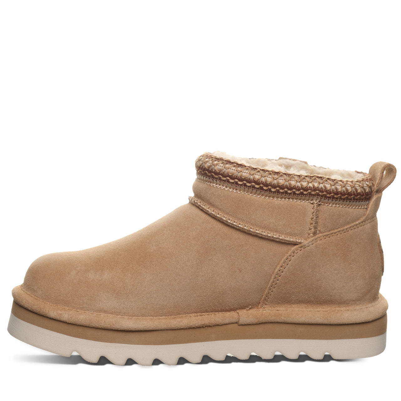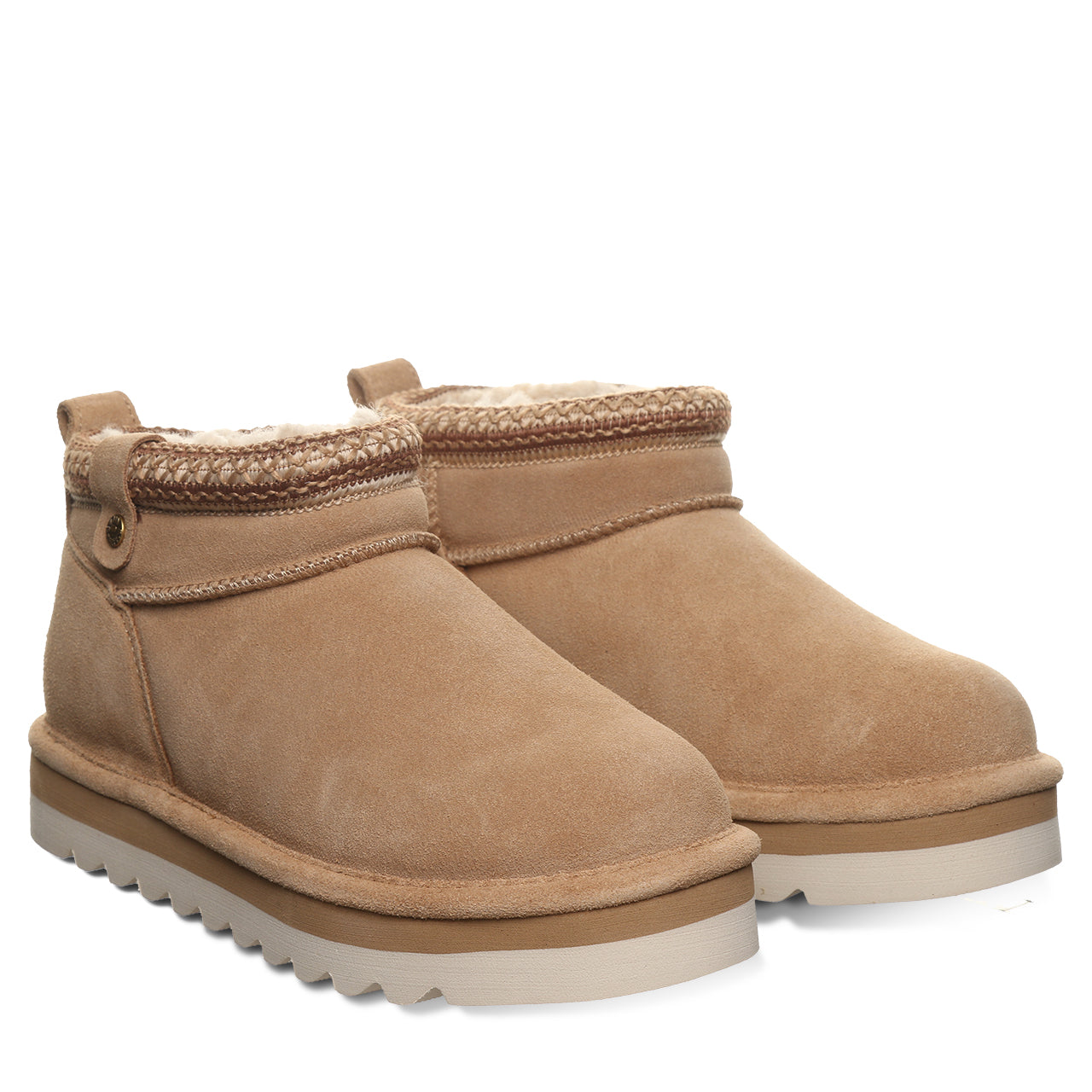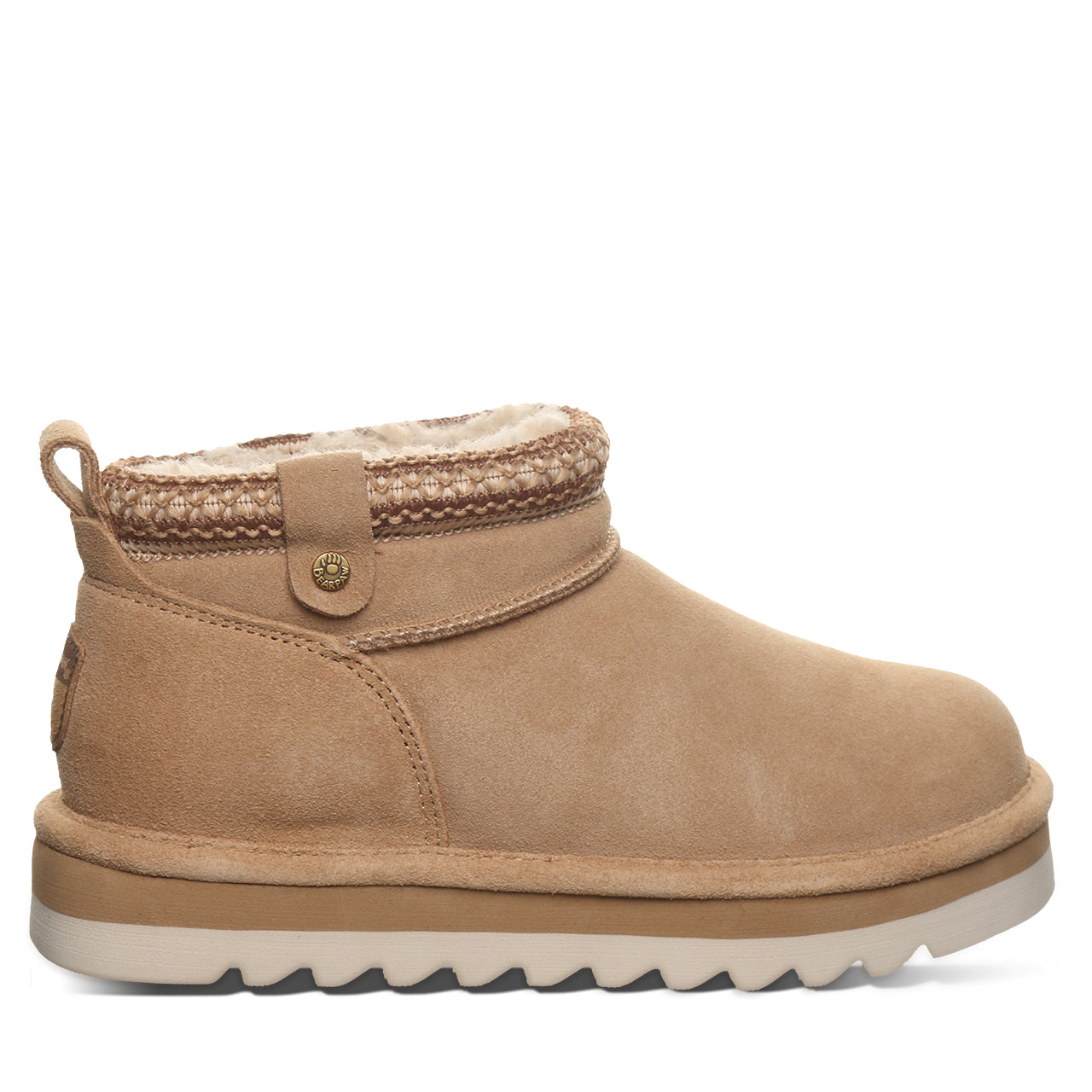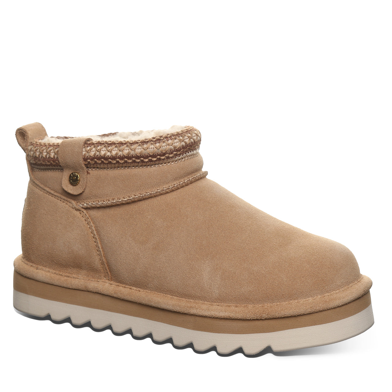 Drawing inspiration from our classic shorty boot. the Langly brings a fresh. modern twist to a timeless favorite. Made with genuine suede and a soft wool-blend lining. these boots will keep you warm and comfortable all day long. The updated silhouette and textured trim add a stylish touch that’s easy to wear with anything—from jeans to joggers. Effortlessly cool and built for your everyday slay. the Langly is a nod to 25 years of Bearpaw style that never goes out of fashion.